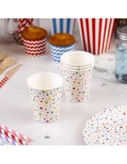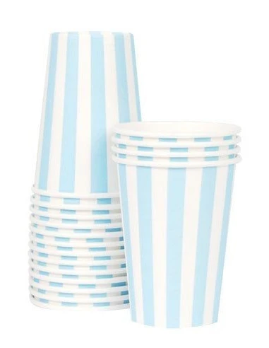 Pour votre décoration de fête baby shower, baptême, mariage, anniversaire pastel, ces 12 gobelets avec des rayures bleu ciel et ivoires.