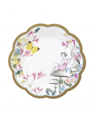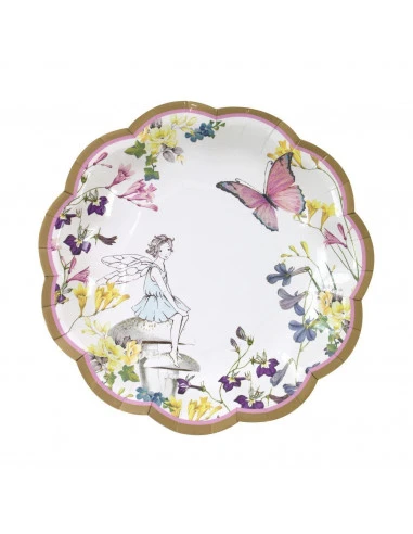 Pour réaliser une décoration d’anniversaire féérique, ces jolies assiettes aux bords arrondies et aux jolis dessins de fées, fleurs et papillons .