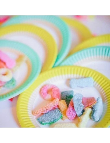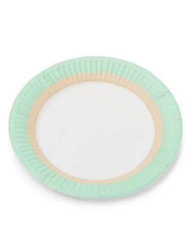 Pour une décoration de table pastel, ces petites assiettes tricolores : vert menthe, beiges, blanches