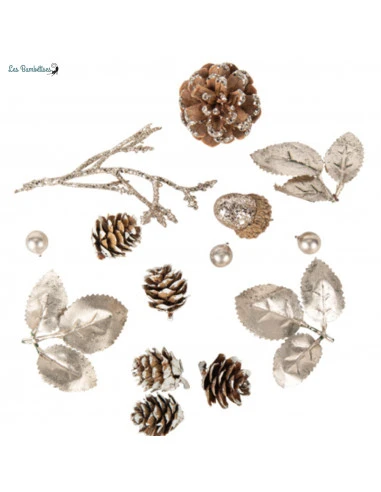 Matière : tige en plastique, feuille en tissue, gland en plastique avec paillettes argent.