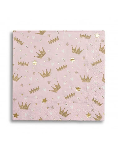 Pour la décoration de votre table de fête, ces grandes serviettes rose pastel avec couronnes mordorées et étoiles brillantes dorées.