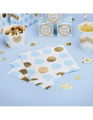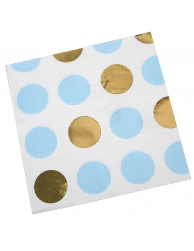 Pour votre décoration de fête anniversaire, de baby shower ou de baptême, ces serviettes avec des motifs pois dorés et bleus .