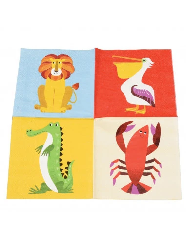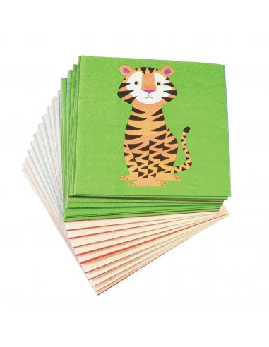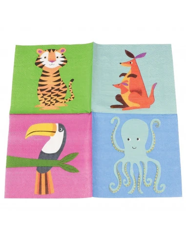 Pour une déco baptême, anniversaire animaux de la jungle, ces petites serviettes avec des animaux colorés .