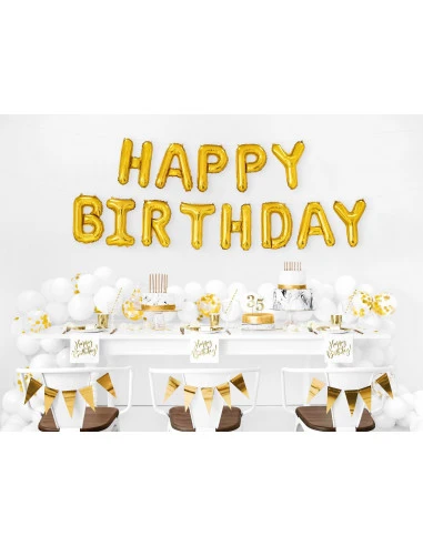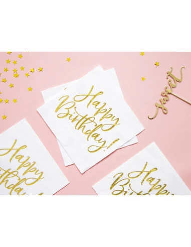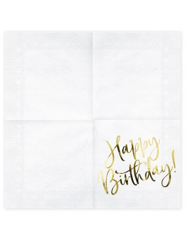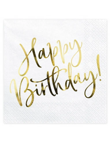 Ces serviettes sont blanches imprimées d’une écriture « Happy Birthday » doré brillant