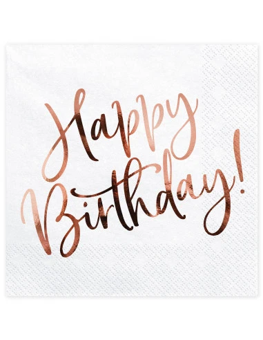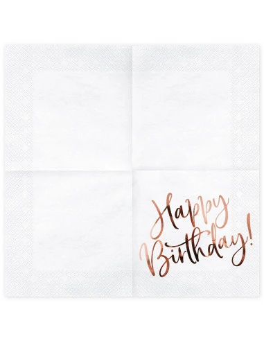 Ces serviettes sont blanches imprimées d’une écriture « Happy Birthday » rose gold brillant