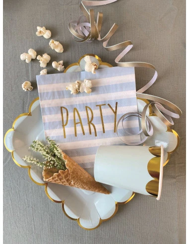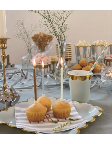 Elles s’harmonisent avec les assiettes carrées bordure dorée et les gobelets bleu ciel frise dorée pour réaliser une déco de table élégante.