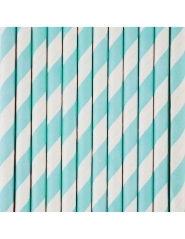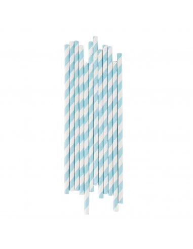 Pour la décoration de votre table de fête, 25 pailles rayées en papier coloris bleu pastel et blanc