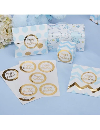 25 stickers ronds avec écriture Happy Birthday dorée sur fond blanc.