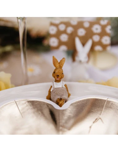 Ajoutez ces 3 Lapins habillés avec une Salopette en Résine en centre de table, sur des assiettes ou dans le jardin.