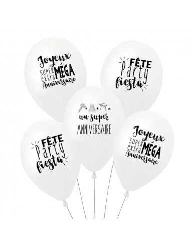Pour la décoration d’une fête anniversaire , ces 5 ballons blancs avec messages anniversaires noirs