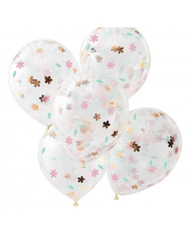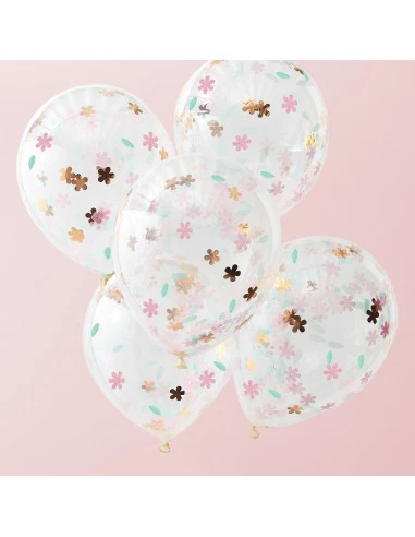 Ce pack de ballons est composé de 5 ballons transparents remplis de confettis fleurs pastels, fleurs rose gold, pétales de fleurs confettis.