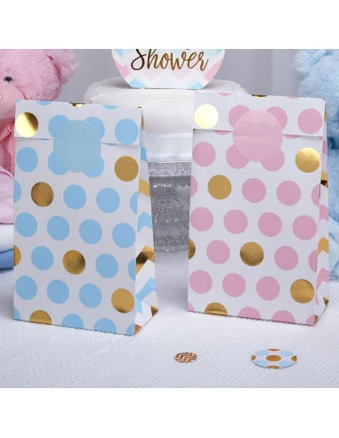 5 pochettes en carton brillant épais fond blanc avec des pois roses et dorés.