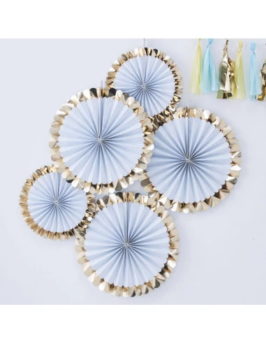 Pour une décoration de baby shower, d’anniversaire ou de baptême, 5 rosaces avec fines rayures bleu ciel et blanches avec bordure dorée