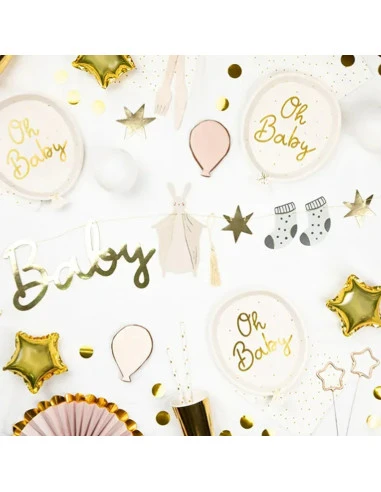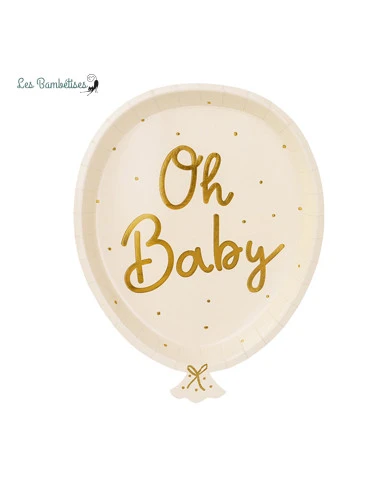 Les assiettes ont une forme originale de ballon de baudruche, elles sont beiges avec des pois dorés et une écriture « oh baby » stylisée.