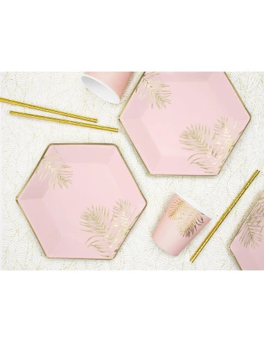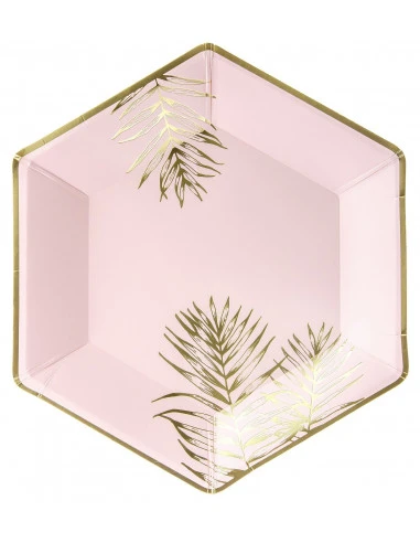 Ces assiettes sont de couleur rose pastel avec des feuilles de palmiers et liseré or imprimés.