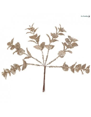 Ces branches d’eucalyptus sont en plastique avec des paillettes dorées collées et sont malléables grâce à la tige de fil de fer .