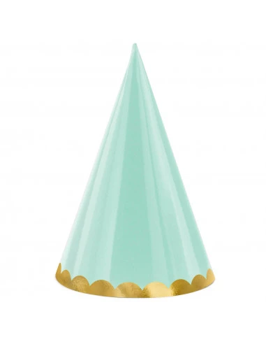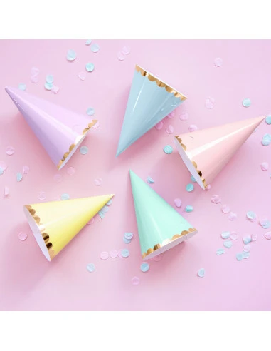 Les couleurs de ces chapeaux pointus sont assorties à la vaisselle jetable bordure dorée disponible sur le site : assiettes, gobelets, serviettes.