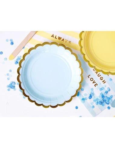 Pour une décoration de table de fête pastel, ces 6 petites assiettes bleu pastel bordure dorée que vous pouvez mélanger avec d’autres assiettes pastels.