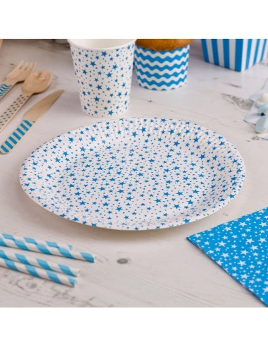 8 assiettes fond blanc étoiles turquoise pour une décoration de fête à mixer aussi avec de la vaisselle unie