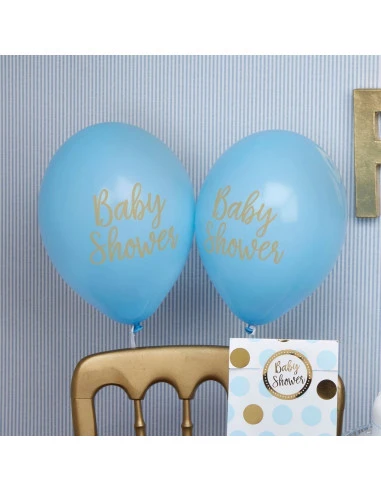 8 ballons bleus avec écriture « Baby shower » dorée pour la décoration de votre fête Baby shower .