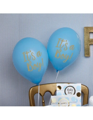 8 ballons bleus avec écriture « It’s a boy » dorée pour la décoration de votre fête Baby shower .