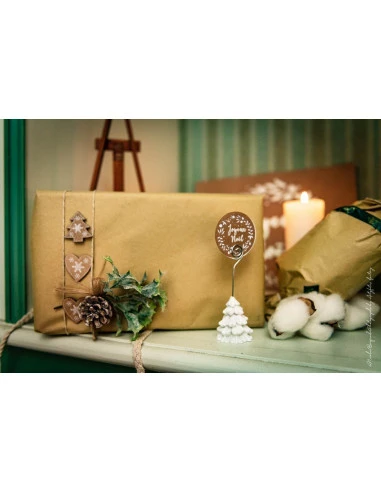 Les étiquettes sont composées de 2 parties : 1 étiquette kraft ajourée avec impression « Joyeux Noel » en blanc et 1 étiquette blanche au dessous .