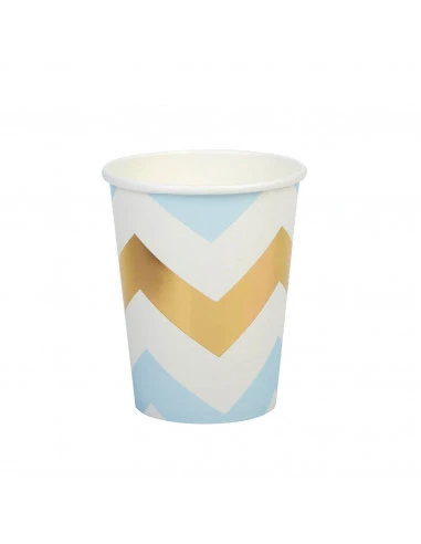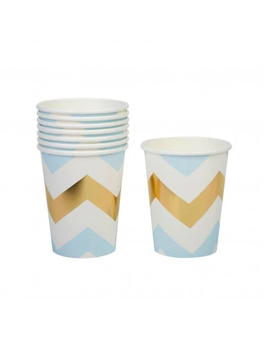 Pour votre décoration de fête anniversaire, de baby shower ou de baptême, ces gobelets avec des motifs chevrons dorés et bleus .