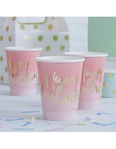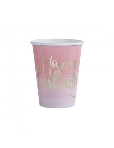 8 gobelets dégradés rose avec écriture » Happy birthday » métallique pour toutes les fêtes; à mélanger avec d’autres imprimés de la collection .