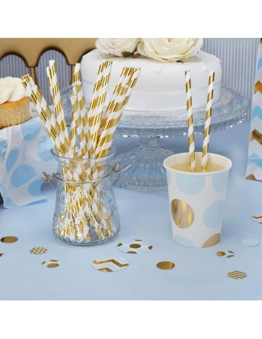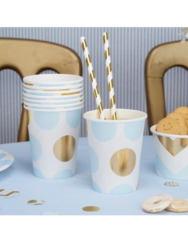 Pour votre décoration de fête anniversaire, de baby shower ou de baptême, ces gobelets avec de grands pois dorés et bleus .