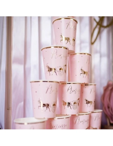 Disposez ces gobelets sur une table avec la vaisselle princesse assortie et nos accessoires de table rose et or: confettis de table, chemin de table …