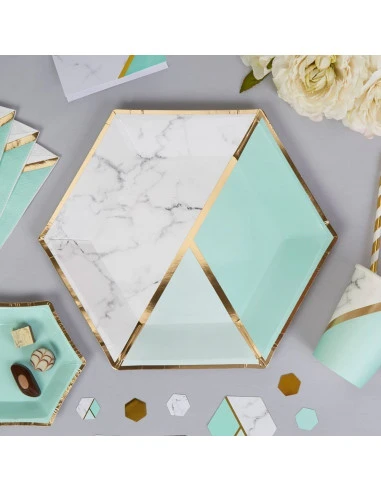 8 assiettes avec découpes et imprimé marbre, vert menthe et rayure dorée.