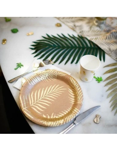 Une déco de table tropical chic avec ces assiettes couleur kraft imprimée de feuilles de palmiers dorées.