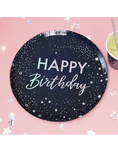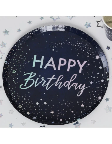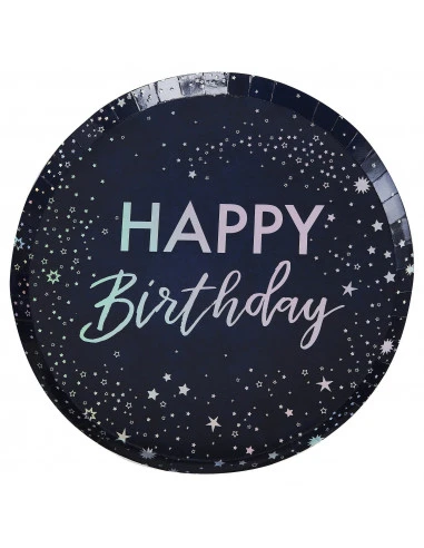 Ces grandes assiettes rondes sont marines avec impression argent irisé .