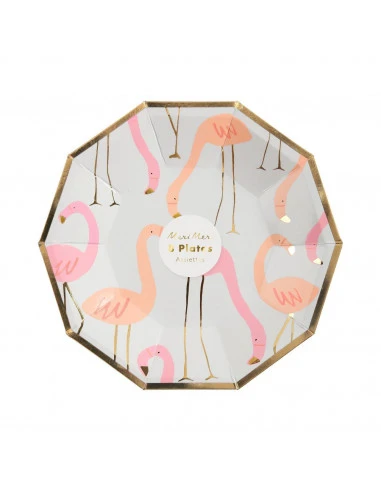 Pour la décoration d’une fête tropicale, ces assiettes flamant rose avec touche dorée brillante.