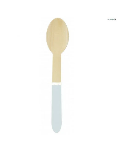 Ces couverts sont fabriqués en bois clair et peints avec une couleur bleu ciel et une frise dorée brillante.