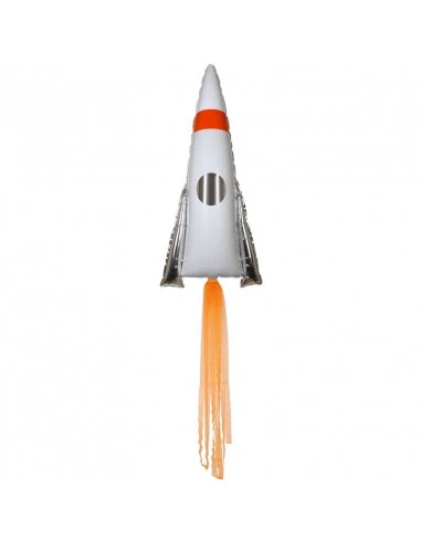 Pour une déco anniversaire astronaute sur le thème de l’espace, ce grand ballon métallique imprimé fusée avec guirlande en papier crépon .