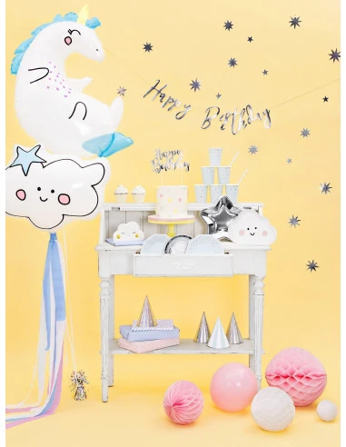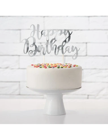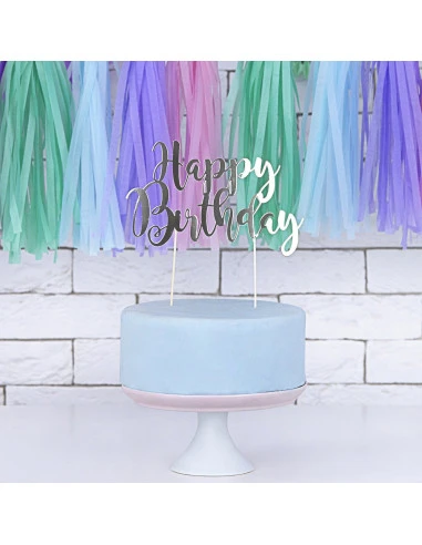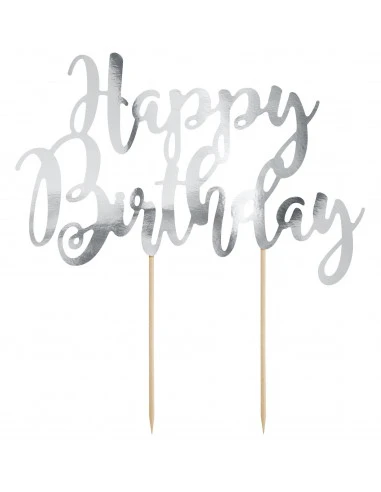 Matière : carton brillant argent sur devant , blanc sur le dos du cake topper, pique bois