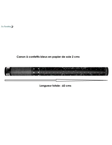 Il a une longueur de 60 cms et contient des confettis bleus en papier de soie de 2 cms de diamètre.