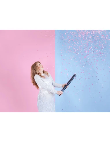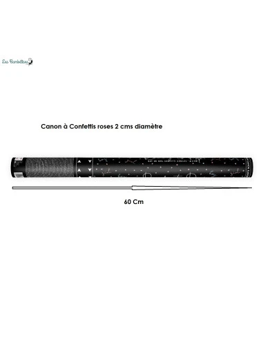Ce canon d’une longueur de 60 cms, contient des confettis roses en papier de soie de 2 cms de diamètre.