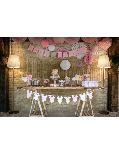Pour la décoration de votre table baby shower rose, ce chemin de table en lin imprimé de rayures roses et d’une écriture paillettes dorées.