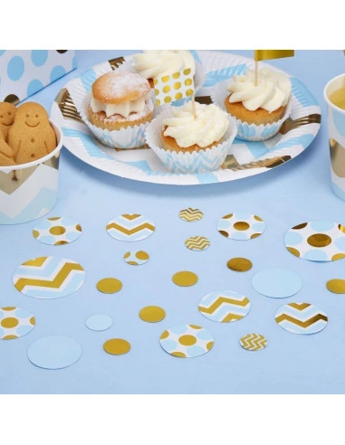 Ce pack comprend des confettis imprimés chevrons bleu ciel et dorés ainsi que des confettis unis bleu ciel et dorés.