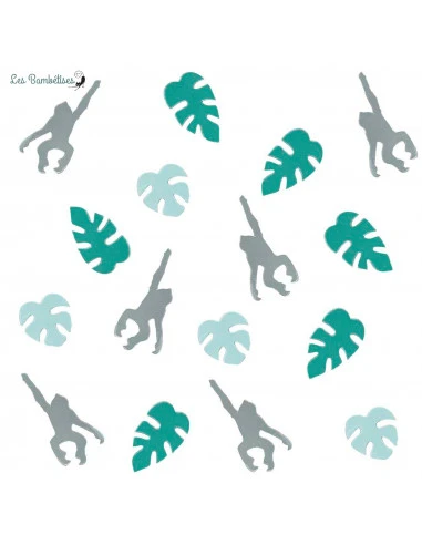 Ces confettis de table en carton comprennent des feuilles tropicales sauge et vert forêt avec des singes marrons .