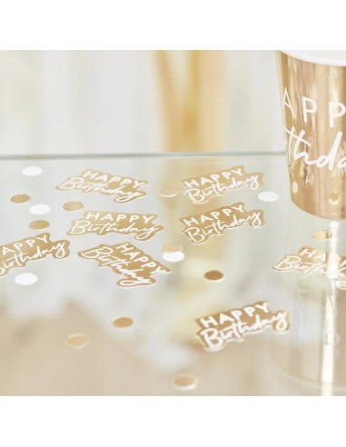 Ces confettis de table sont assortis à la vaisselle jetable Happy Birthday blanc et or pour décorer un anniversaire adulte 18 ans, 20 ans, 30ans, 40 ans …