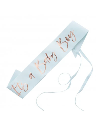 Cette ceinture est bleu pastel avec écriture rose gold.