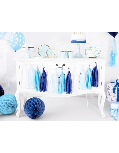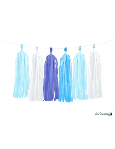 Pour compléter la guirlande 12 tassels bleu et blanc, ajouter une guirlande lettres et des ballons de baudruche bleus et blancs.