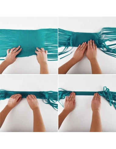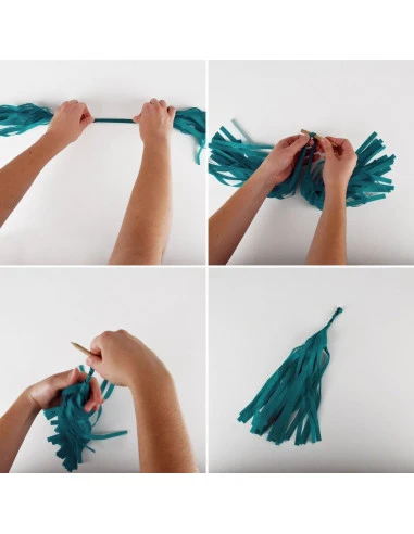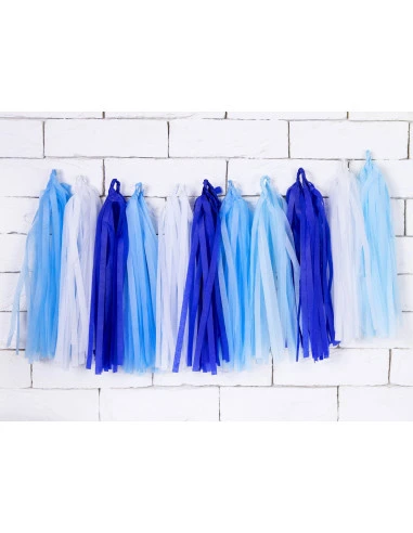 Cette guirlande est composée de 12 tassels dans les coloris : blanc, bleu ciel, turquoise et marine
