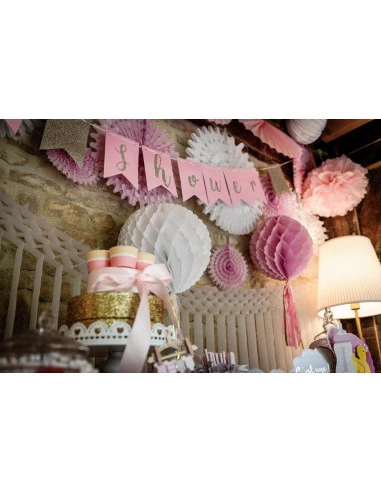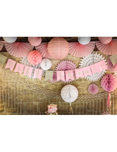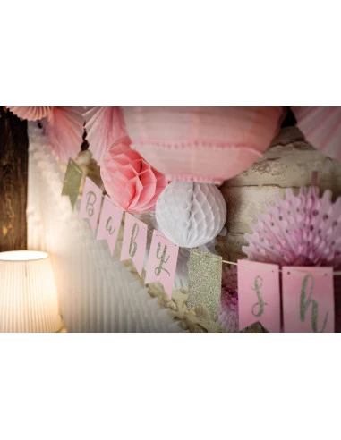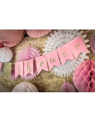 Pour la déco de votre baby shower rose, cette guirlande fanion avec écriture métallique .