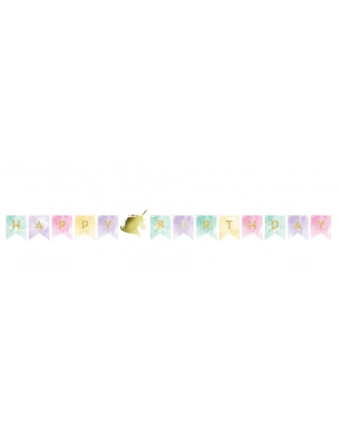 Pour la décoration de votre fête anniversaire licorne, cette guirlande pastel licorne avec écriture « Happy Birthday » doré.