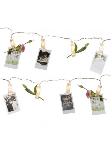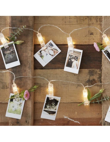 Accrochez vos photos souvenirs ou messages sur cette guirlande lumineuse avec pinces ; vous pouvez aussi créer un coin photoboot où vos invités pourront y accrocher les photos de votre fête .