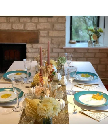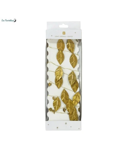 Elle est composée de feuilles métallique en or mat avec 20 leds pour illuminer une table de Noel, une table de mariage blanc et or .